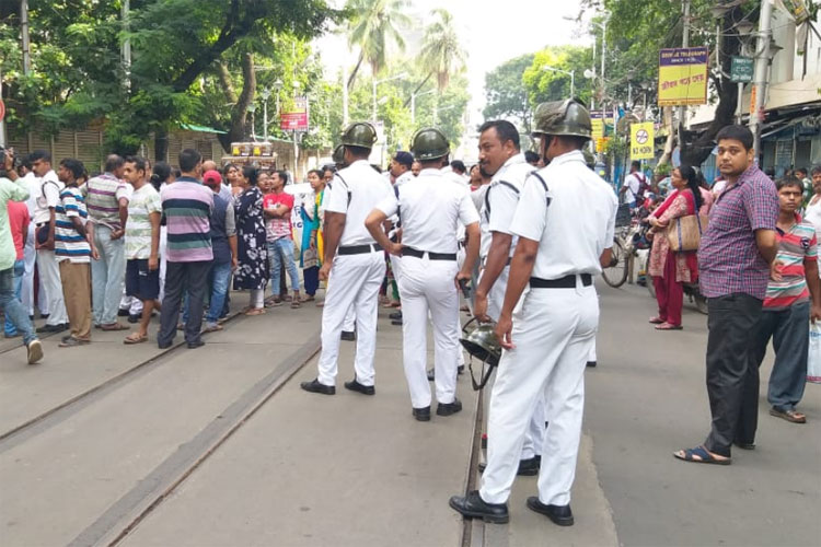 পরিস্থিতি নিয়ন্ত্রণে কলেজ স্ট্রিটে বিশাল পুলিশ বাহিনী। —নিজস্ব চিত্র।