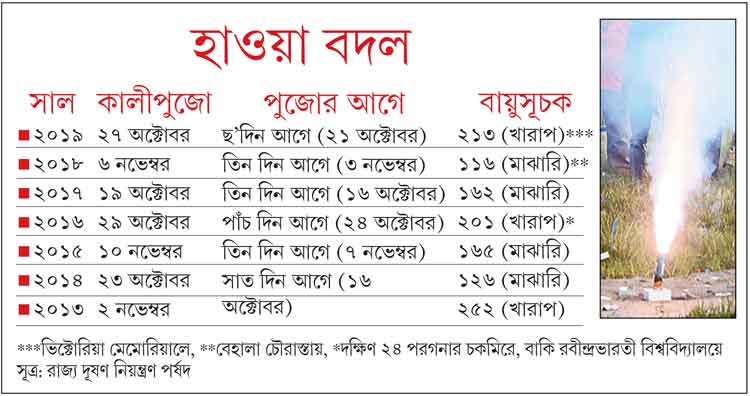 এমনিতে গত কয়েক বছরের বায়ুদূষণ সংক্রান্ত তথ্য বলছে, কালীপুজোর কয়েক দিন আগে থেকেই কলকাতার বায়ুসূচকের মান ক্রমশ খারাপ হতে থাকে। তবে গত বছরের কালীপুজো ও দীপাবলিতে অতীতের সমস্ত রেকর্ড ভেঙে গিয়েছিল। গত বছরের ৬ নভেম্বর (কালীপুজোর দিনে) বিটি রোডের রবীন্দ্রভারতী বিশ্ববিদ্যালয় এলাকায় বায়ুসূচকের মান ছিল ‘খুব খারাপ’। তার পরের দিন, অর্থাৎ দীপাবলিতে ছিল ‘মারাত্মক’। সে দিন বাতাসে ভাসমান ধূলিকণার পরিমাণ ছিল প্রতি ঘনমিটারে ১৭২৭.২ মাইক্রোগ্রাম (যা সহনশীল মাত্রার থেকে ১৭ গুণ বেশি)। ফলে এ বছরেও আশঙ্কায় দিন গুনছেন পরিবেশকর্মীরা। এক পরিবেশকর্মীর কথায়, ‘‘যত দিন যাচ্ছে ততই শব্দবাজি ফাটানোর প্রবণতা বাড়ছে, তা পরিসংখ্যান দেখলেই স্পষ্ট। এ বারও তার পুনরাবৃত্তি হবে বলে আমাদের আশঙ্কা।’’