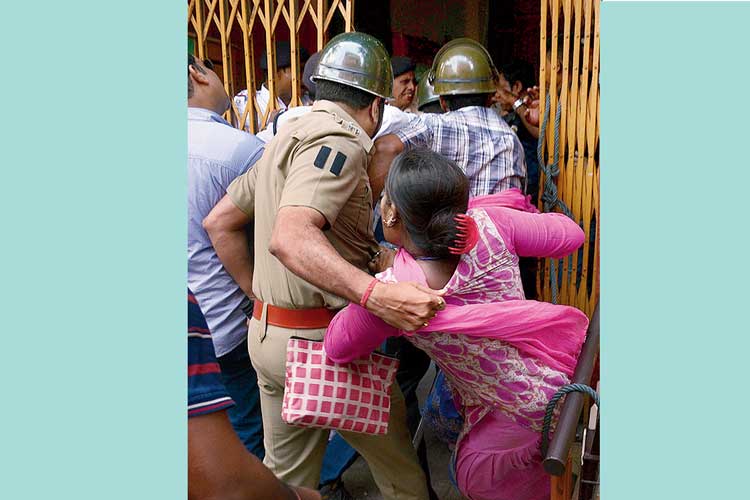 এক বিক্ষোভকারীকে সরিয়ে দিচ্ছে পুলিশ।
