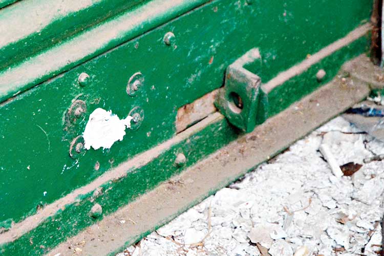 এ ভাবেই সিমেন্ট দিয়ে সিল করা হয়েছে দোকানের শাটার (চিহ্নিত)। শুক্রবার, দমদম ক্যান্টনমেন্টের নতুনবাজারে। ছবি: স্নেহাশিস ভট্টাচার্য