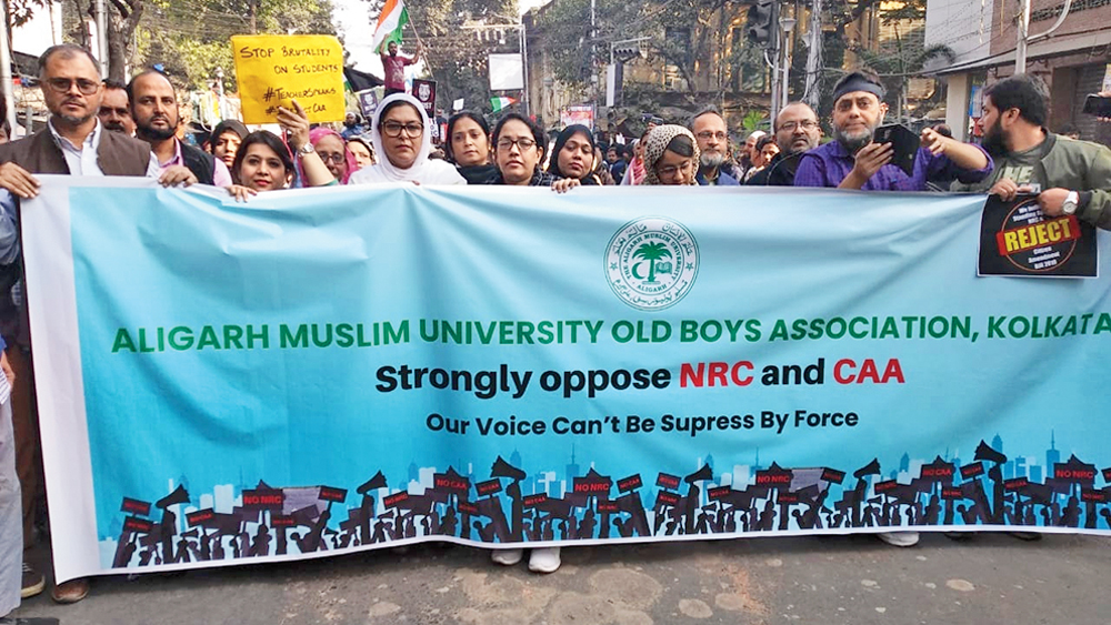 ‘আলিগড় মুসলিম ইউনিভার্সিটি ওল্ড বয়েজ অ্যাসোসিয়েশন’-এর ব্যানার নিয়ে এ দিন শহরে হাঁটলেন ওই বিশ্ববিদ্যালয়ের প্রায় তিনশো জন প্রাক্তন পড়ুয়া। ওই সংগঠনের সম্পাদক, পেশায় ইঞ্জিনিয়ার ওয়াকার খানের কথায়, ‘‘এত বছর ধরে এ দেশে রয়েছি। আমাদের সম্প্রীতি কিন্তু বরাবর অটুট ছিল। এখন বিজেপি সরকার ধর্মের ভিত্তিতে যে ভাবে দেশটাকে ভাগ করতে চাইছে, তা কোনও ভাবেই বরদাস্ত করা যাবে না।’’ সংগঠনের সভাপতি আতাউল্লাহ খানের কথায়, ‘‘দিল্লির জামিয়া মিলিয়া ইসলামিয়া এবং আলিগড় মুসলিম বিশ্ববিদ্যালয়ের পড়ুয়াদের পুলিশ যে ভাবে লাঠিপেটা করেছে, তার তীব্র নিন্দা করছি। সেই সঙ্গে বিজেপি সরকারের প্রতি আমাদের হুঁশিয়ারি, নাগরিকত্ব আইন প্রত্যাহার না করলে আমরা বড়সড় আন্দোলনের পথে যাব।’’ আলিগড় মুসলিম বিশ্ববিদ্যালয়ের প্রাক্তনীদের সঙ্গে তাঁদের ছেলেমেয়েরাও এ দিন মিছিলে হেঁটেছেন।