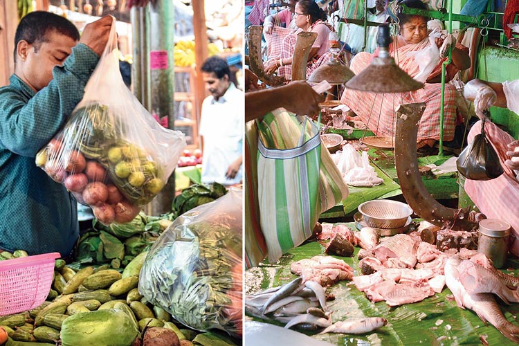অবাধ: (বাঁ দিকে) গড়িয়াহাট বাজারে প্লাস্টিকের ব্যাগেই চলছে আনাজ বেচাকেনা। (ডান দিকে) ক্রেতার কাছে নাইলনের ব্যাগ থাকা সত্ত্বেও প্লাস্টিকের ব্যাগেই মাছ দিচ্ছেন বিক্রেতা (চিহ্নিত)। হাওড়ার কদমতলা বাজারে। রবিবার। ছবি: সুমন বল্লভ, দীপঙ্কর মজুমদার