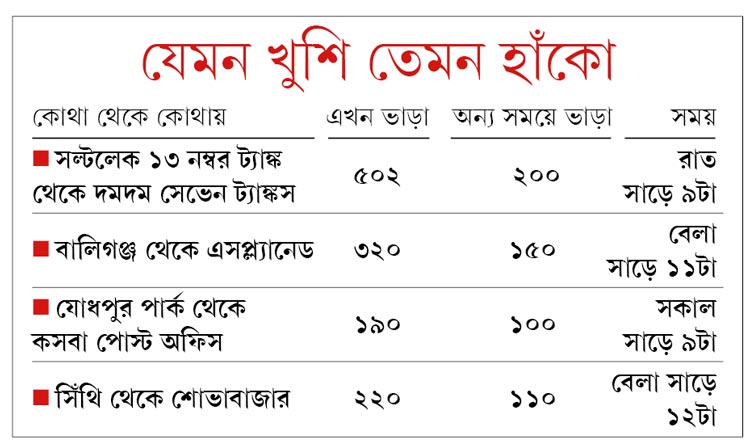 মঙ্গলবার বেলা সাড়ে ১১টা নাগাদ বালিগঞ্জ থেকে এসপ্ল্যানেড যেতে অ্যাপ-ক্যাবে ওঠেন সুজিত বিশ্বাস। তাঁকে গুনতে হয় ৩২০ টাকা! সুজিত জানান, সাধারণত ওই দূরত্বের জন্য ভাড়া দিতে হয় ১৪০-১৫০ টাকা।