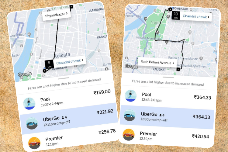 তার উপর যাত্রীদের অভিযোগ, অ্যাপ ক্যাব বুকিংয়ে যে সময় দেখাচ্ছে তা আধ ঘণ্টারও উপরে। তার উপর ভাড়াও অনেক বেশি দেখাচ্ছে, তাই বুকিংয়ের পর বাধ্য হয়ে বাতিল করতে হচ্ছে, তাতে আলাদা করে চার্জও দিতে হচ্ছে। সোমবার ভোরে গড়িয়া থেকে সাঁতরাগাছি যাওয়ার জন্য এক যুবকের কাছ থেকে অ্যাপ-ক্যাবের তরফে ৯০০ টাকা চাওয়া হয়েছে। অ্যাপ-ক্যাবে হাওড়া থেকে বেহালার ভাড়া দেখাচ্ছে ৭২৮ থেকে ৮০০ টাকা। অফিস টাইমেও যা সর্বাধিক ৫০০ টাকা হয়। মঙ্গলবার বেলা ১২টা নাগাদ চাঁদনী চক থেকে শ্যামবাজারের ভাড়া দেখাচ্ছে ২২১ টাকা ৯২ পয়সা, আর চাঁদনী চক থেকে রাসবিহারী অ্যাভিনিউয়ের ভাড়া দেখাচ্ছে ৩৬৪ টাকা ৩৩ পয়সা।