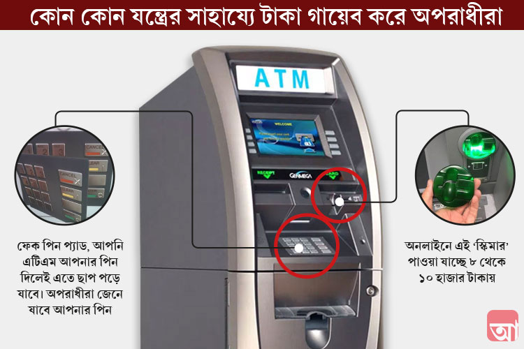 আসলে দলবল নিয়ে কালো কাপড়ে মুখ ঢেকে ব্যাঙ্ক ডাকাতির দিন চলে গিয়েছে। টাকা লুট করার জন্য বন্দুকেরও দরকার পড়ে না। ‘স্কিমার’ নামক একটি ছোট্ট যন্ত্রই যথেষ্ট। এটিএমে ‘কার্ড’ ঢোকানোর মুখে লাগিয়ে দিলেই হল। আপনার ব্যাঙ্কে কত টাকা আছে, চোখের পলকে জেনে যাবে সাইবার অপরাধীরা। দ্রুত অ্যাকাউন্ট থেকে গায়েব হয়ে যাবে কষ্টার্জিত অর্থ!