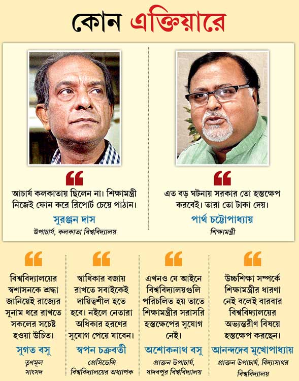 বুধবার কলকাতা বিশ্ববিদ্যালয়ের সেনেট হলে শিক্ষক নিগ্রহের ঘটনার পরেই উপাচার্য সুরঞ্জন দাসের কাছে রিপোর্ট তলব করেছিলেন শিক্ষামন্ত্রী পার্থ চট্টোপাধ্যায়। বৃহস্পতিবার সেই রিপোর্ট বিকাশ ভবনে গিয়ে জমাও দিয়েছেন উপাচার্য। কিন্তু বিশ্ববিদ্যালয় একটি স্বশাসিত প্রতিষ্ঠান। তাঁর শীর্ষ পদে রয়েছেন খোদ আচার্য তথা রাজ্যপাল। তিনি উপাচার্যের কাছে বিশ্ববিদ্যালয় সম্পর্কিত বিষয়ে রিপোর্ট তলব করতে পারেন। শিক্ষামন্ত্রী কেন উপাচার্যের কাছে রিপোর্ট চাইবেন? আর উপাচার্যই বা কেন শিক্ষামন্ত্রীর কাছে রিপোর্ট দিয়ে আসবেন? এ তো সরাসরি বিশ্ববিদ্যালয়ের স্বায়ত্তশাসনে হস্তক্ষেপ!