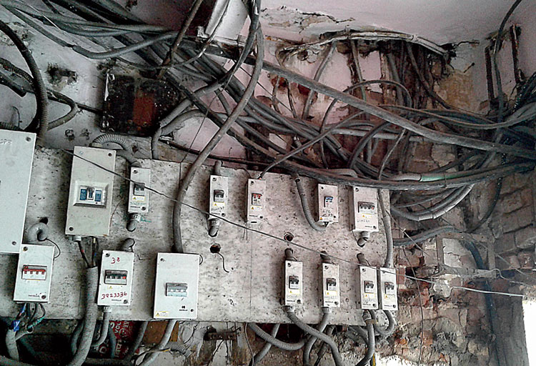 পার্ক স্ট্রিটে কুইন্স ম্যানসনের মিটার বক্সে জড়িয়ে তারের জট।