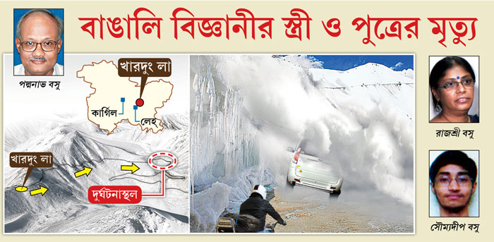 লাদাখে বেড়াতে গিয়ে তুষারধসের মধ্যে পড়ে এ ভাবেই প্রাণ হারালেন রবীন্দ্রভারতী বিশ্ববিদ্যালয়ের রাষ্ট্রবিজ্ঞানের বিভাগীয় প্রধান রাজশ্রী বসু (৫২) ও তাঁর ছেলে খড়্গপুর আইআইটি-র পদার্থবিদ্যার দ্বিতীয় বর্ষের ছাত্র সৌম্যদীপ (২০)। রাজশ্রীদেবীর স্বামী, সাহা ইনস্টিটিউট অব নিউক্লিয়ার ফিজিক্স-এর বিজ্ঞানী পদ্মনাভ বসু এখনও লেহ্-র হাসপাতালে আইসিইউ-এ ভর্তি রয়েছেন। গাড়ির চালক আবদুল হককে মঙ্গলবার সকালে হাসপাতাল থেকে ছাড়া হয়েছে।