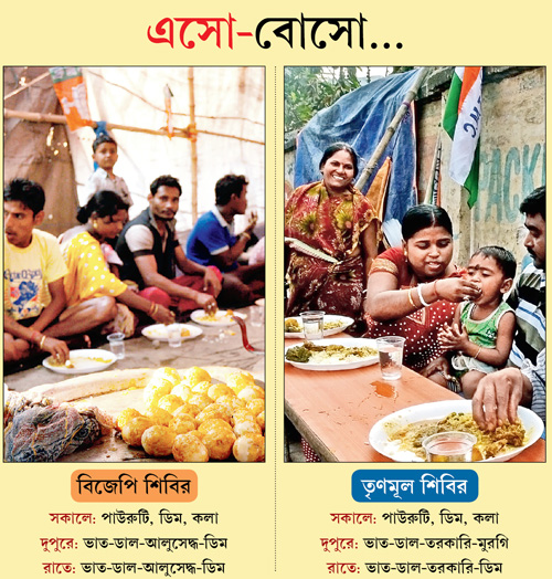 এ দিন ভরদুপুরে বিজেপি-র ডিম-ভাতের শিবিরে লাইন দিয়েছিলেন অনেকেই। তা দেখেই তৃণমূলকর্মীরা হাঁকডাক শুরু করে দেন, “এ দিকে আসুন। পেট ভরে মাংস-ভাত খেয়ে যান।” খিদের মুখে এমন ডাক শুনে কেউ কেউ শিবির বদলেছেন। অনেকেই আবার ডিম-ভাতে পেট ভরিয়ে ফেলায় মুরগির স্বাদ থেকে বঞ্চিত থেকেছেন।
