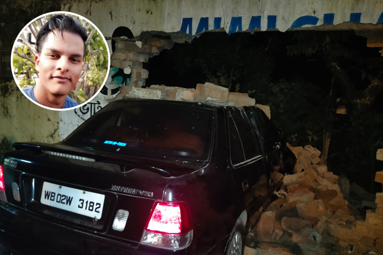 রয়্যাল ক্যালকাটা ক্লাবের পাঁচিলে ধাক্কা মারার পর আকাশের (ইনসেটে) গাড়ি। নিজস্ব চিত্র।