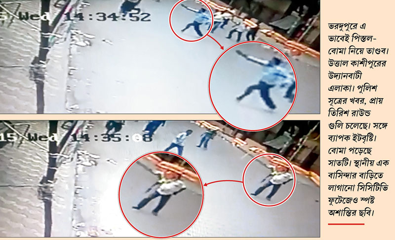 ঘটনাস্থল: কাশীপুর। সেখানকার উদ্যানবাটী এলাকায় বুধবার ভরদুপুরে মুড়ি-মুড়কির মতো ইট, বোমা পড়ল। এমনকী, গুলিও চলল বৃষ্টির মতো। দিশেহারা পথচারীরা যে যে দিকে পারলেন, ছুটে পালালেন। কেউ কেউ দৌড়ে গিয়ে আশ্রয় নিলেন লাগোয়া বস্তির ঘরে। বিপদ বুঝে উদ্যানবাটীর নিরাপত্তারক্ষীরাও তড়িঘড়ি গেট বন্ধ করে তালা ঝুলিয়ে দিলেন।