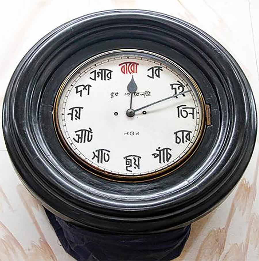 দোকানের মিষ্টি খেয়ে খুশি হয়ে সাহেব উপহার দিয়েছিলেন এক দেওয়ালঘড়ি। ইংরেজি পড়তে না জানা দোকানের কর্মীদের জন্য তাতে সময়ের চিহ্ন লেখা হয়েছিল বাংলা হরফে। বৌবাজারের ভীমচন্দ্র নাগের দোকানের দেওয়ালে টাঙানো কুক অ্যান্ড কেলভি কোম্পানির সেই ঘড়ি আজ হয়ে উঠেছে কলকাতার ঐতিহ্যের নিদর্শন (ছবি)। এরই প্রেরণায় তৈরি, বাংলা হরফে ঘণ্টা-নির্দেশক নম্বর লেখা ডায়ালযুক্ত হাতঘড়ি তৈরি হয়েছে আর পাওয়াও যাচ্ছে শহর কলকাতায়, এ খবরে একপ্রস্ত হইচই পড়েছে সমাজমাধ্যমে। ঐতিহ্য ও সৌন্দর্যের মিলিত আকর্ষণের বাইরে এও খেয়াল করার: এ বার হাতে হাতে ঘোরা সময় মাপার যন্ত্রে বাংলায় লেখা হল। বাংলা ভাষা ও ভাষী দুই নিয়েই যখন ঘরে-বাইরে তুমুল হট্টগোল, তখন এই সহজ সাধারণ ও অন্য রকম ভাবনাটি বেশ।