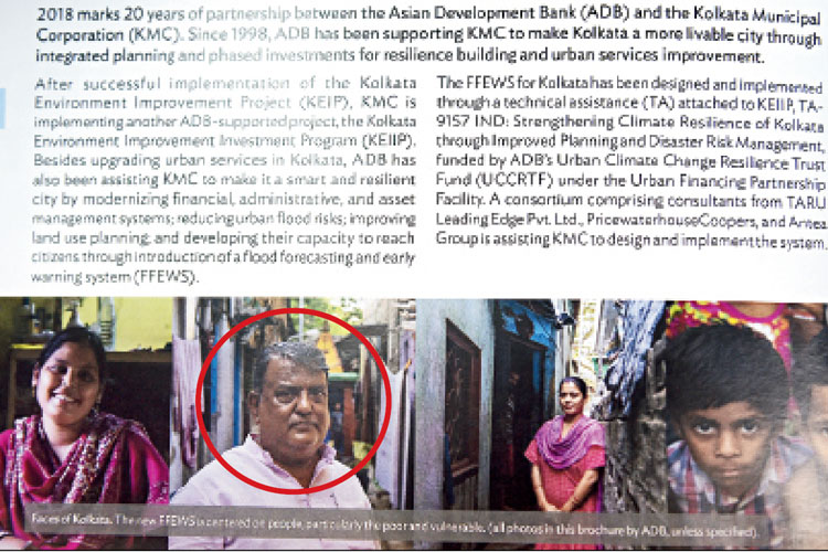 সেই সময়ে এডিবি-র তৈরি করা ‘টুওয়ার্ড রেসিলিয়েন্ট কলকাতা’ নামে একটি বই প্রকাশ করা হয়েছিল। সেই বইয়েরই প্রথম পৃষ্ঠায় ‘কলকাতার মুখ’ বলে কয়েক জন শহরবাসীর ছবি ছাপানো হয়েছে। ক্যাপশনের জায়গায় লেখা হয়েছে, বন্যার মতো প্রাকৃতিক বিপর্যয়ে ক্ষতিগ্রস্ত হওয়ার আশঙ্কা রয়েছে তেমন মানুষদের, বিশেষ করে দরিদ্রদের কথা ভেবেই এই এফএফইডব্লিউএস প্রযুক্তি চালু করা হয়েছে। মোট চার জনের মুখের ছবির মধ্যে দ্বিতীয় ছবিটিই হল তরুণবাবুর! আর গোল বেধেছে ওই ছবিটি নিয়েই। তরুণবাবু এ বিষয়ে বলেন, ‘‘এডিবি-র প্রথম প্রকল্প আমার এলাকা থেকেই শুরু হয়েছিল। সবচেয়ে আগে আমিই প্রকল্প শেষ করেছি। ওরা (এডিবি) এসে বলেছিল, আমার ছবি ব্যবহার করবে। কিন্তু সেটা যে এ ভাবে করা হয়েছে, তা জানতাম না!’’ এ বিষয়ে এডিবি-র ‘ইন্ডিয়া রেসিডেন্ট মিশন’-এর ‘সিনিয়র এক্সটারনাল রিলেশনস অফিসার’ রাজেশ কুমার দেওলের সঙ্গে যোগাযোগ করা হলে তিনি বলেন, ‘‘এটি একটি সাধারণ ক্যাপশন। কাউকে আলাদা ভাবে চিহ্নিত করা হয়নি এখানে।’’