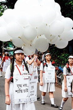 শান্তির বার্তা নিয়ে পথে নামল স্কুলপড়ুয়ারা। —নিজস্ব চিত্র