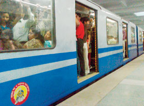 এক দিকে ট্যাক্সি ধর্মঘট, তার উপরে সন্ধ্যার অফিস ফেরত ভিড়। দুইয়ে মিলে যখন মেট্রো যাত্রীদের করুণ অবস্থা, সে সময়ে আচমকাই বন্ধ হয়ে গেল একটি মেট্রোর বাতানুকূল ব্যবস্থা। মঙ্গলবার সন্ধ্যায় ঘটনাটি ঘটেছে কালীঘাট স্টেশনে, কবি সুভাষগামী মেট্রোতে। দমবন্ধ পরিবেশ স্টেশনে ঢোকার আগে থেকেই তৈরি হচ্ছিল। কালীঘাট স্টেশনে মেট্রোটি থামার পরে অবস্থা আরও খারাপ হয়। কর্মীরা এসে মেরামতির চেষ্টা করেন। কিন্তু কাজ না হওয়ায় যাত্রীদের নেমে যেতে বলা হয়। প্রথমে যাত্রীরা নামতে চাননি। বারবার অনুরোধ করার পরে যাত্রীরা নেমে আসেন। এর পরে ওই রেকটিকে কারশেডে পাঠানো হয়। এর জেরে প্রায় ১০ মিনিট মেট্রো চলাচলে বিঘ্ন ঘটে।