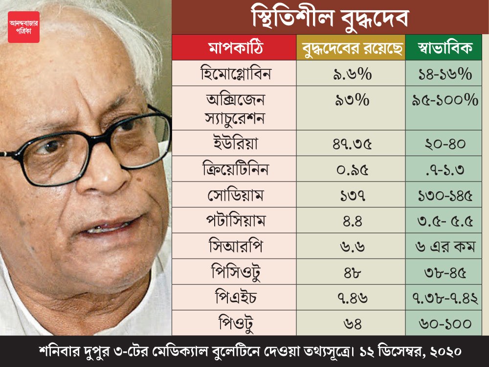 ভেন্টিলেশন থেকে বার করা হলেও আপাতত বুদ্ধবাবু বাইপ্যাপ সাপোর্টেই রয়েছেন। গ্রাফিক: শৌভিক দেবনাথ
