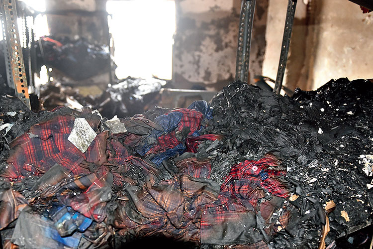দগ্ধ: নন্দরাম মার্কেটে পুড়ে যাওয়া কাপড়ের স্তূপ। রবিবার। ছবি: বিশ্বনাথ বণিক
