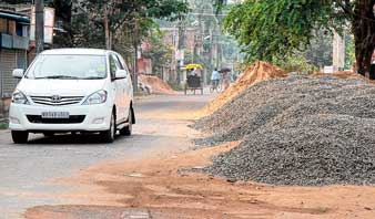 রাস্তায় ডাঁই করা রয়েছে বালি ও পাথরকুচি।