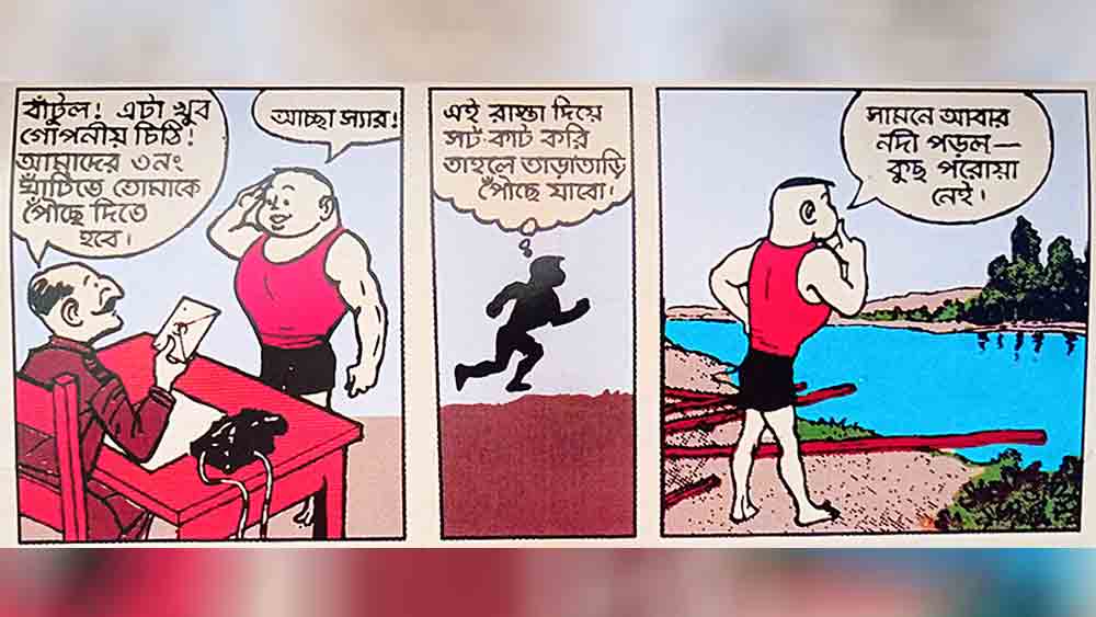 নারায়ণ দেবনাথ মানে কি শুধুই নন্টে-ফন্টে, হাঁদা-ভোঁদা, বাঁটুল? ছয় দশকেরও বেশি সময় দেড় হাজারেরও বেশি কমিক্স সৃষ্টি করেছেন তিনি। অলঙ্করণ শিল্পী ছিলেন তার আগে থেকেই, সমকালীন বিখ্যাত সাহিত্যিকদের লেখার অলঙ্করণ করেছেন। পদ্মশ্রী সম্মানে ভূষিত, নবতিপর শিল্পীর কৃতি উঠে এসেছে নতুন বছরের ‘পদ্মশ্রী নারায়ণ দেবনাথ ক্যালেন্ডার ২০২২’-এ, অগ্নিভ চক্রবর্তীর পরিকল্পনায়। পাতায় পাতায় বাঙালির জনপ্রিয় কার্টুন-চরিত্র, শিল্পীর স্বল্প-আলোচিত কাজও। আছে গোয়েন্দা কৌশিক, ডানপিটে খাঁদু আর তার কেমিক্যাল দাদু, পটলচাঁদ দি ম্যাজিশিয়ান, শুঁটকি আর মুটকি, বাহাদুর বেড়াল ও বুদ্ধিমান কুকুর; শিল্পীর করা একাধিক পূজাবার্ষিকীর প্রচ্ছদ ও অলঙ্করণ, কার্টুন স্ট্রিপ, বিখ্যাত সাহিত্যিকদের গল্পের নামাঙ্কন, স্বপনকুমারের সৃষ্টি গোয়েন্দা দীপক ও রতনলালের রহস্যগল্প সিরিজ়ের প্রচ্ছদ ও অলঙ্করণ— স্মৃতিমেদুরতার আনন্দ। বিশেষ আকর্ষণ শিল্পীর করা ৩টি ‘অরিজিন্যাল’ আর্টওয়ার্ক। ক্যালেন্ডারের খোঁজে দক্ষিণ কলকাতার রিড বেঙ্গলি বুক স্টোর-এ নারায়ণ দেবনাথ-অনুরাগীদের ভিড় হলে অবাক হওয়ার কিছু নেই। ছবিতে ’৬৫-র ভারত-পাকিস্তান যুদ্ধের পটভূমিকায় রচিত বাঁটুল দি গ্রেট কার্টুনের অংশ, ক্যালেন্ডার থেকে।