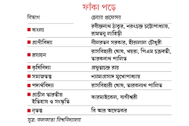 দেড়শো বছরেরও বেশি পুরনো কলকাতা বিশ্ববিদ্যালয়ে বিশিষ্টজনদের নামে বহু ‘চেয়ার প্রফেসর’ পদ রয়েছে। কিন্তু এক দশকেরও বেশি সময় ধরে খালি পড়ে রয়েছে প্রায় অর্ধেকেরও বেশি চেয়ার। যেখানে খোদ মুখ্যমন্ত্রী মমতা বন্দ্যোপাধ্যায় বিশিষ্টজনদের সম্মানে একাধিক পদক্ষেপ করেন, সেখানে চেয়ারগুলি পূরণের ক্ষেত্রে কলকাতা বিশ্ববিদ্যালয়ের কোনও উদ্যোগই নেই বলে অভিযোগ।
