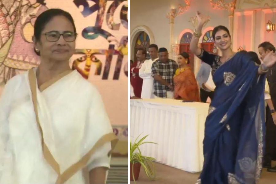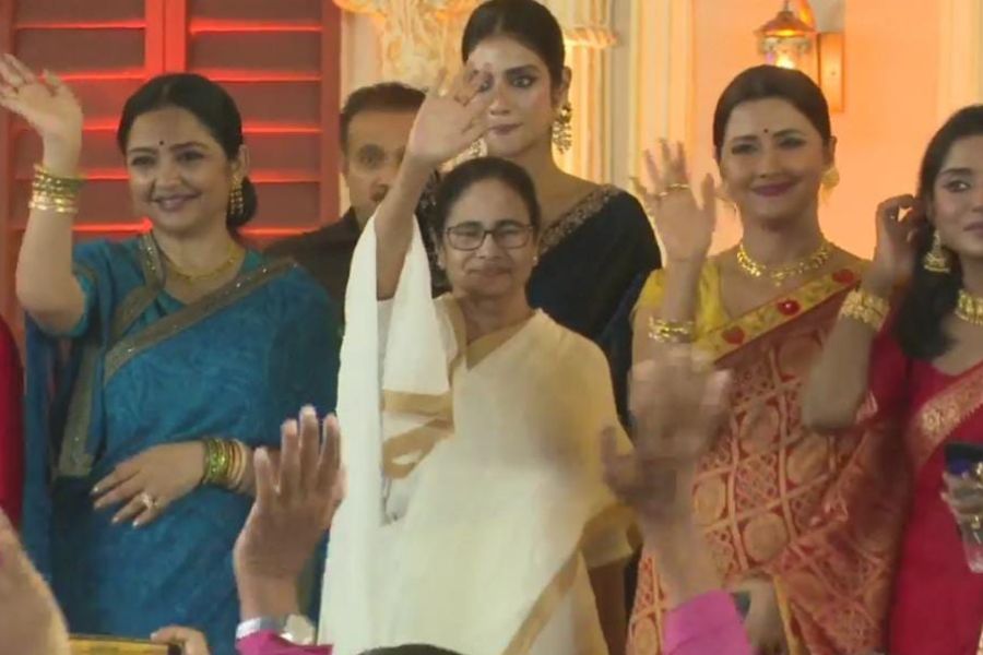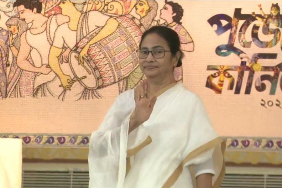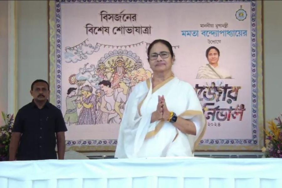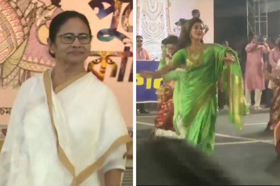 পুজোর থিমে উঠে এল ডান্ডিয়া নাচ। মুখ্যমন্ত্রী মমতা বন্দ্যোপাধ্যায়ও অন্যদের সঙ্গে তাতে অংশ নিলেন।