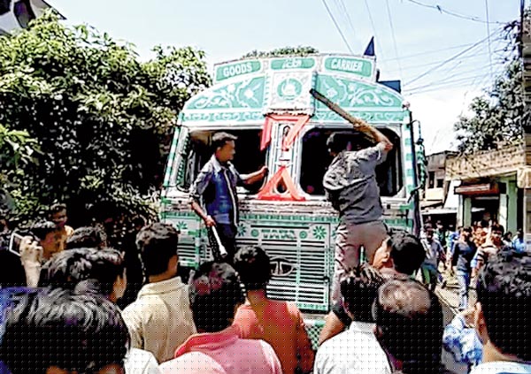 ক্ষোভ: দুর্ঘটনার পরে ঘাতক লরিটির উপরে ভাঙচুর চালাচ্ছে স্থানীয় জনতা। মঙ্গলবার, রাজারহাটে। নিজস্ব চিত্র