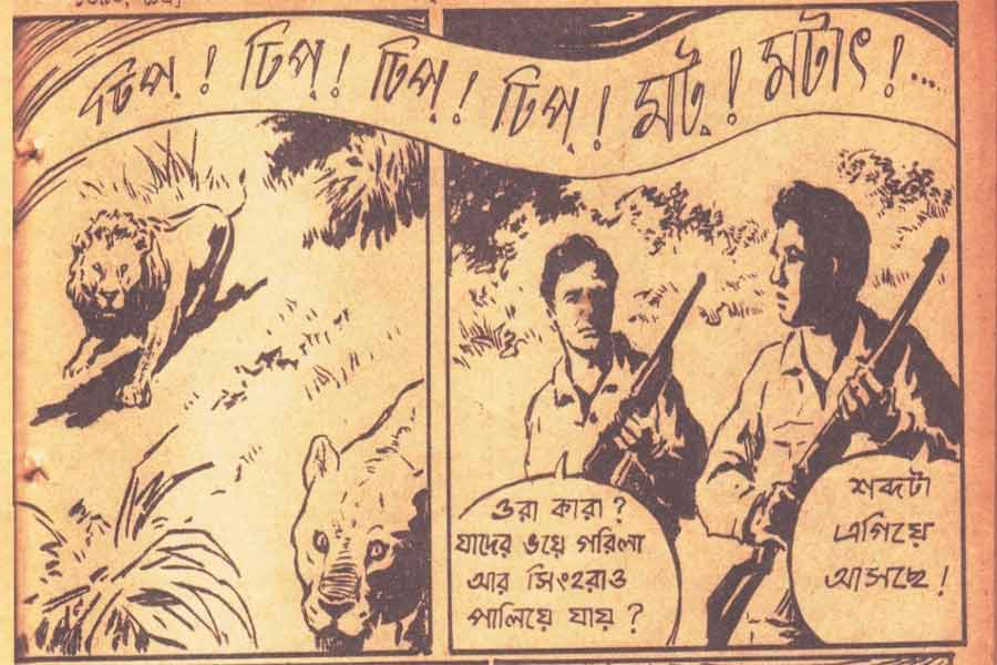 যখের ধন আর আবার যখের ধন, মনে আছে? হেমেন্দ্রকুমার রায়ের জনপ্রিয় দুই উপন্যাস ধারাবাহিক ভাবে বেরিয়েছিল মৌচাক পত্রিকায়, যথাক্রমে ১৯২৩ ও ১৯৩১ থেকে। দু’টিই পরে গ্রন্থাকারে বেরোয়। তার অনেক পরে, আশির দশকে শুকতারা পত্রিকায় ধারাবাহিক ভাবে প্রকাশিত হয় আবার যখের ধন অবলম্বনে কমিক্স গুপ্তধনের সন্ধানে, চলেছিল পাঁচ বছর ধরে। অ্যাডভেঞ্চার-কাহিনির দুই কেন্দ্রীয় চরিত্র, দুঃসাহসী বাঙালি যুবক বিমল-কুমারের মুখাবয়বে শিল্পী ময়ূখ চৌধুরী ফুটিয়ে তুলেছিলেন বাঙালির প্রিয় দুই নায়ক উত্তমকুমার ও সৌমিত্র চট্টোপাধ্যায়ের আদল, পাঠক লুফে নিয়েছিলেন তা। ছোটদের পত্রিকার পাতা থেকে উঠে এসে সেই কাজই এ বার বেরোল ঝকঝকে গ্রাফিক নভেল রূপে— আবার যখের ধন (প্রকা: বুক ফার্ম)। চেহারা ও মেজাজ অক্ষুণ্ণ রাখতে মূল সাদা-কালো প্যানেলগুলি অপরিবর্তিত (ছবি মূল পত্রিকার), পড়েনি ডিজিটাল রং। গত ৯ নভেম্বর হয়ে গেল আনুষ্ঠানিক প্রকাশ।