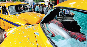 দিনের দুর্গতির চিত্র। ভবানীপুর এলাকায় ট্যাক্সি ভাঙচুর।