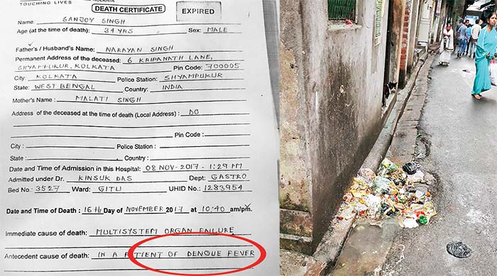 সঞ্জয় সিংহের ডেথ সার্টিফিকেট। তাতে উল্লেখ রয়েছে ডেঙ্গির। এলাকায় এখনও জমে রয়েছে আবর্জনা শুক্রবার, শোভাবাজারে।
