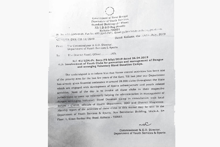 গত এপ্রিলে দফতরের তৎকালীন প্রধান সচিব অজিতরঞ্জন বর্ধন ওই নির্দেশিকা জারি করেন। জুলাইয়ে সেই নির্দেশিকার সূত্র ধরেই দফতরের কমিশনার আরও একটি নির্দেশিকা জারি করেছেন। তাতে বলা হয়েছে, অনুদান পাওয়া সমস্ত ক্লাবকে ডেঙ্গি মোকাবিলার পাশাপাশি, স্বেচ্ছায় রক্তদান শিবির করার কাজও করতে হবে। কোন কোন ক্লাব সেই কর্মসূচি নিচ্ছে, সে সম্পর্কে প্রতি মাসে দফতরকে রিপোর্ট পাঠাতে হবে জেলা যুব আধিকারিকদের।