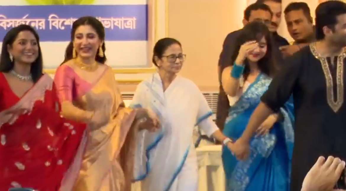মঞ্চে অভিনেতা-অভিনেত্রী এবং দলের মহিলা সাংসদ-বিধায়কদের সঙ্গে নৃত্য পরিবেশন মুখ্যমন্ত্রী মমতার।