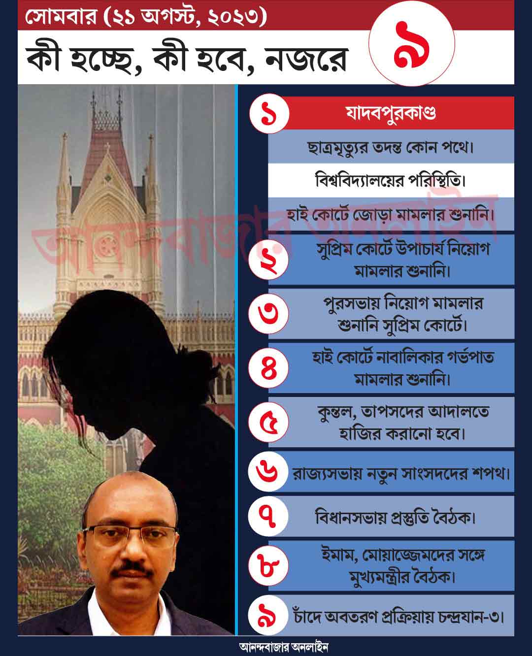 রোজই নতুন নতুন তত্ত্ব সামনে আসছে যাদবপুরকাণ্ডের তদন্তে। তা নিয়ে একাধিক মামলাও চলছে। সোমবার সপ্তাহের প্রথম দিনেও যাদবপুরের দিকে নজর থাকবে। সেই সঙ্গে কলকাতা হাই কোর্ট এবং সুপ্রিম কোর্টের দিকেও নজর রাখতে হবে। কারণ, কয়েকটি গুরুত্বপূর্ণ মামলার শুনানি রয়েছে। আবার রাজ্যসভা থেকে রাজ্য বিধানসভাতেও নজর রাখতে হবে।
