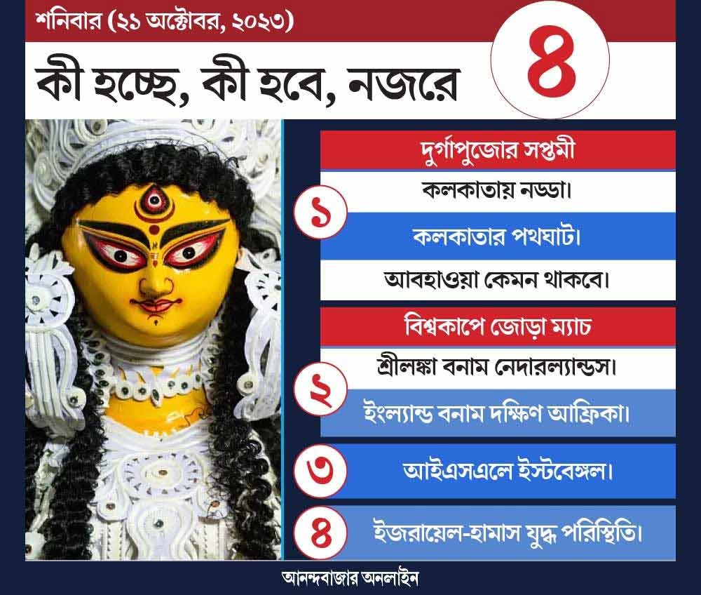 আজ মহাসপ্তমীতে কলকাতায় শারোদৎসবে যোগ দিতে আসছেন বিজেপির সর্বভারতীয় সভাপতি জেপি নড্ডা। তাঁর আর পুজো উদ্বোধন করার সুযোগ নেই। তবে বেশ কয়েকটি পুজো মণ্ডপে যাবেন তিনি। রাজ্য বিজেপি সূত্রে জানা গিয়েছে, সকাল ১১টা নাগাদ নড্ডা কলকাতায় পৌঁছবেন। বিমানবন্দর থেকে সোজা চলে যাবেন হাওড়ার বেলিসিয়ার রোডের একটি পুজো মণ্ডপে। সেখান থেকে যাবেন শোভাবাজার রাজবাড়ি। এর পরে নিউ মার্কেট সর্বজনীনের পুজো মণ্ডপ ঘুরে চলে যাবেন নিউ টাউনের একটি হোটেলে। সেখান থেকে বিকেলেই বিমানে দিল্লি ফেরার কথা। সপ্তমীতে কলকাতার রাস্তাঘাটের অবস্থা কেমন থাকবে সে দিকের পাশাপাশি নজর থাকবে আবহাওয়ার খবরে।