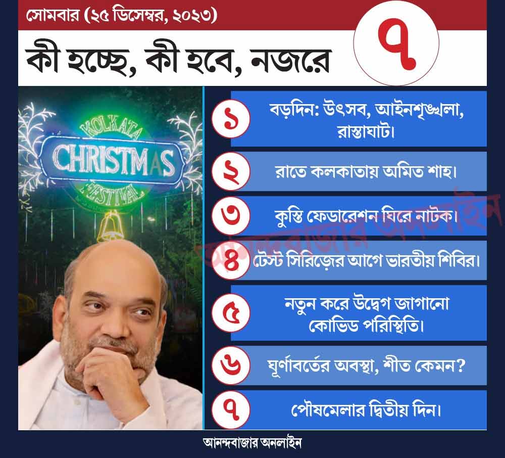 বড়দিনের হাত ধরে ইংরেজি নববর্ষের উৎসব পর্ব শুরু হয়ে গেল। উৎসব মানে যেমন আনন্দের ঢল, আবার উৎসব মানে প্রশাসনিক সতর্কতাও। ভিড়ের এলাকায় আইনশৃঙ্খলা নিয়ে সোমবার বাড়তি সতর্ক থাকবে পুলিশ। পরিস্থিতি অনুযায়ী চলবে যানবাহন নিয়ন্ত্রণও। সব আপডেট থাকবে আনন্দবাজার অনলাইনে।
