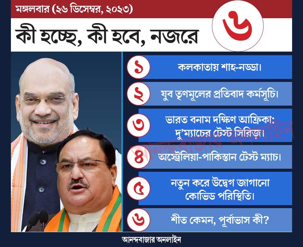 এক দিনের সফরে আজ কলকাতায় আসছেন শাহ এবং নড্ডা। আর আজই স্বামী বিবেকানন্দকে নিয়ে রাজ্য বিজেপির সভাপতি সুকান্ত মজুমদারের একটি মন্তব্যের বিরুদ্ধে ময়দানে নামছে যুব তৃণমূল। আজ বিকেল ৩টের সময় শ্যামবাজার পাঁচ মাথার মোড় থেকে সিমলা স্ট্রিটের স্বামীজির বাড়ি পর্যন্ত যুব তৃণমূলের একটি প্রতিবাদ মিছিল হবে। ওই মিছিলে নেতৃত্ব দেবেন যুব তৃণমূলের সভানেত্রী সায়নী ঘোষ। এ ছাড়া রাজ্য জুড়ে ব্লক স্তরে এই কর্মসূচি পালিত হবে। নজরে থাকবে এই খবর।