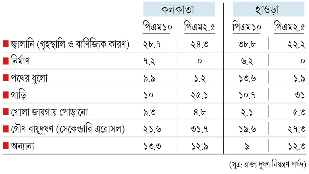 নিরি সূত্রের খবর, গ্রীষ্মের তুলনায় শীতে এমনিতেই কলকাতা ও হাওড়া, দুই শহরের বাতাসে পিএম-এর পরিমাণ অনেকটাই বেশি থাকে। নিরির এক বিজ্ঞানীর কথায়, ‘‘এই স্বাভাবিক। কারণ শীতে বাতাসের গতি থাকে না। ফলে দূষকগুলি এক জায়গায় থমকে দাঁড়িয়ে থাকে।’’ তথ্য অনুযায়ী, শীতকালে পিএম১০-এর উপস্থিতির নিরিখে শহরের মধ্যে শীর্ষে রয়েছে শ্যামবাজার (পিএম১০-এর উপস্থিতি সহনমাত্রার থেকে প্রায় ছ’গুণ বেশি)। যেখানে প্রতি ঘনমিটারে পিএম১০ থাকার কথা ১০০ মাইক্রোগ্রাম, সেখানে শ্যামবাজারে ওই পরিমাণ প্রতি ঘনমিটারে ৬৩২.৫ মাইক্রোগ্রাম। হাওড়ার ক্ষেত্রে পিএম১০-এর উপস্থিতির নিরিখে শীর্ষস্থানে রয়েছে হাওড়া ময়দান (প্রতি ঘনমিটারে ৬১০ মাইক্রোগ্রাম)। আবার অতি সূক্ষ্ম ধূলিকণার (পিএম২.৫) উপস্থিতির নিরিখে শহরের মধ্যে মৌলালি প্রথম স্থানে (পিএম২.৫-এর উপস্থিতি সহনমাত্রার থেকে প্রায় চার গুণ বেশি)। যেখানে প্রতি ঘনমিটারে পিএম ২.৫-এর পরিমাণ ৬০ মাইক্রোগ্রাম থাকার কথা, সেখানে মৌলালিতে তার মাত্রা প্রতি ঘনমিটারে ২৬৩ মাইক্রোগ্রাম। হাওড়ার ক্ষেত্রে প্রথম স্থানে ফের সেই হাওড়া ময়দানই (পিএম২.৫-এর উপস্থিতি প্রতি ঘনমিটারে ৩৭৯ মাইক্রোগ্রাম)। পরিবেশকর্মীদের সংগঠন ‘সবুজ মঞ্চ’-এর সম্পাদক নব দত্ত বলছেন, ‘‘কয়েক বছর ধরে শ্যামবাজার, মৌলালি, এন্টালি-সহ কিছু জায়গা থেকে বাজির অভিযোগ এসেছে। আগে এ সব জায়গা থেকে অতটা অভিযোগ আসত না। ফলে বলা যেতে পারে, ওই জায়গাগুলি বাজি-দূষণের ক্ষেত্রে নতুন সংযোজন।’’