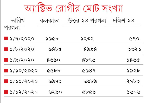 নভেম্বরের শেষ সপ্তাহ থেকেই আক্রান্তের হার কমতে শুরু করে। সঙ্গে বাড়তে থাকে সুস্থতার হার। ফলে অ্যাক্টিভ রোগীর সংখ্যা কমতে শুরু করে। ১ ডিসেম্বর কলকাতায় আক্রান্ত হন ৮০৭ জন। সুস্থ হন ৯৪৬ জন। ওই তারিখে উত্তর ২৪ পরগনায় আক্রান্ত হন ৭৯৬ জন। সুস্থ হন ৯৫২ জন। পুরো ডিসেম্বরেই এই ধারা বজায় ছিল। শনিবার, ২ জানুয়ারি কলকাতায় আক্রান্ত হন ২১১ জন। সুস্থ হয়েছেন ৩৪৪ জন। অ্যাক্টিভ রোগীর সংখ্যা ছিল ২৫৪৯। উত্তর ২৪ পরগনায় শনিবার অ্যাক্টিভ রোগীর সংখ্যা ছিল ১৯৩৮।
