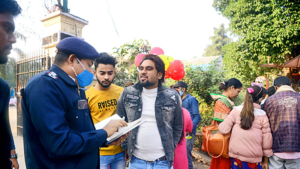 মাস্ক ছাড়া চিড়িয়াখানা ঘুরতে আসা দর্শকদের নাম-ঠিকানা লিখে রাখছেন এক পুলিশকর্মী। ছবি: স্বাতী চক্রবর্তী
