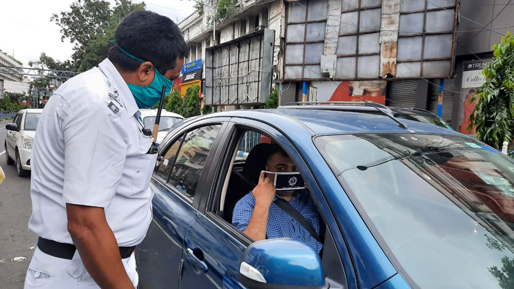 অসচেতন নাগরিকদের মাস্ক ‘পরাতে’ কোমর বেঁধে নেমেছে কলকাতা পুলিশ। —নিজস্ব চিত্র।