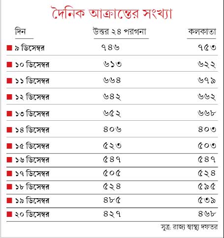 রাজ্য স্বাস্থ্য দফতরের বুলেটিন অনুযায়ী, পয়লা ডিসেম্বর কলকাতায় অ্যাক্টিভ রোগী ছিল ৬২৯০। উত্তর ২৪ পরগনায় সেই সংখ্যা ছিল ৫৯৪৯। মাত্র ২০ দিনে ওই দুই জেলায় অ্যাক্টিভ রোগী প্রায় দু’হাজার জন করে কমেছে। রবিবার পর্যন্ত কলকাতায় অ্যাক্টিভ রোগী ৪২৮১ এবং উত্তর ২৪ পরগনায় ৩৩৭৮ জন। অথচ নভেম্বরের মাঝামাঝি পর্যন্ত দৈনিক সংক্রমিতের থেকে সুস্থতার হার কিছুটা কম ছিল। ফলে অ্যাক্টিভ রোগীর সংখ্যাও ছিল ঊর্ধ্বমুখী।