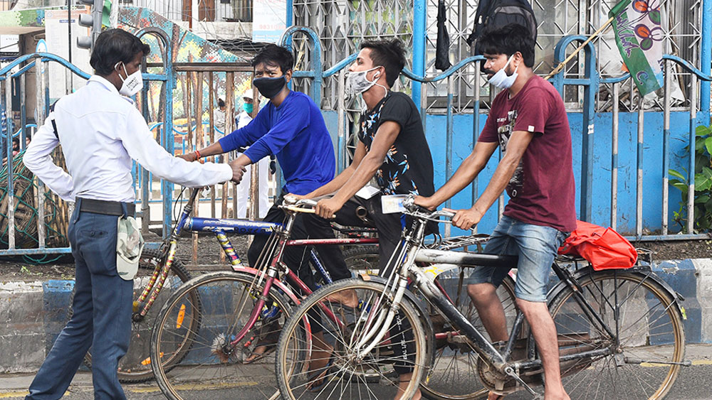 বাগুইআটিতে তিন সাইকেল আরোহীকে বেরোনোর কারণ জিজ্ঞাসা করছেন এক পুলিশকর্মী। ছবি: সুমন বল্লভ