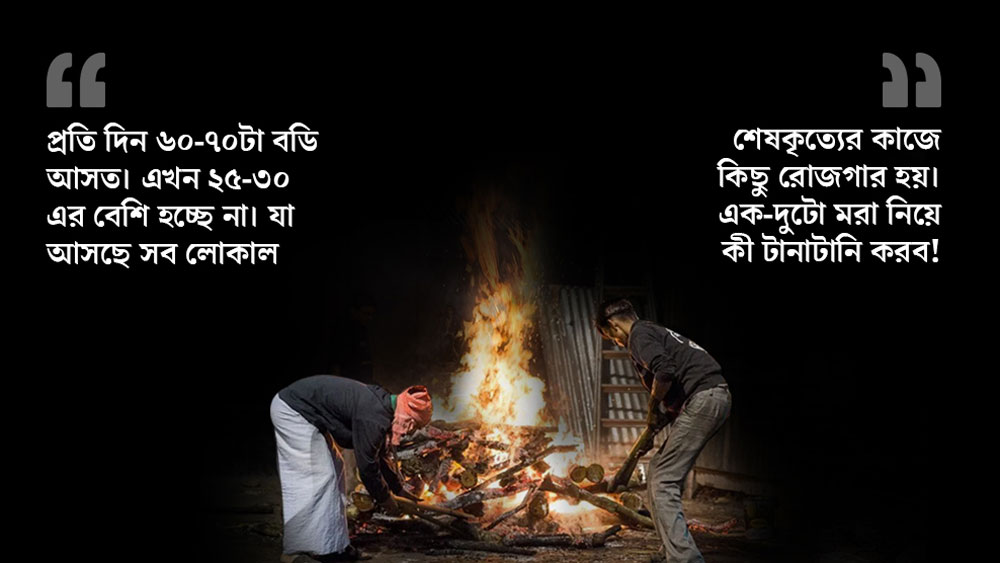 বাইরের চত্বরে মোবাইলে তাস খেলছিলেন সুরজ। প্রশ্ন শুনে আমার দিকে না তাকিয়েই বলতে শুরু করলেন, “আগে দাদা প্রতি দিন ৬০-৭০টা বডি আসত। এখন ২৫-৩০এর বেশি হচ্ছে না। যা আসছে সব লোকাল।”