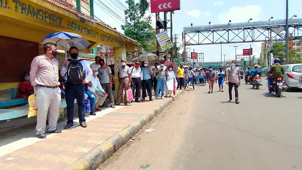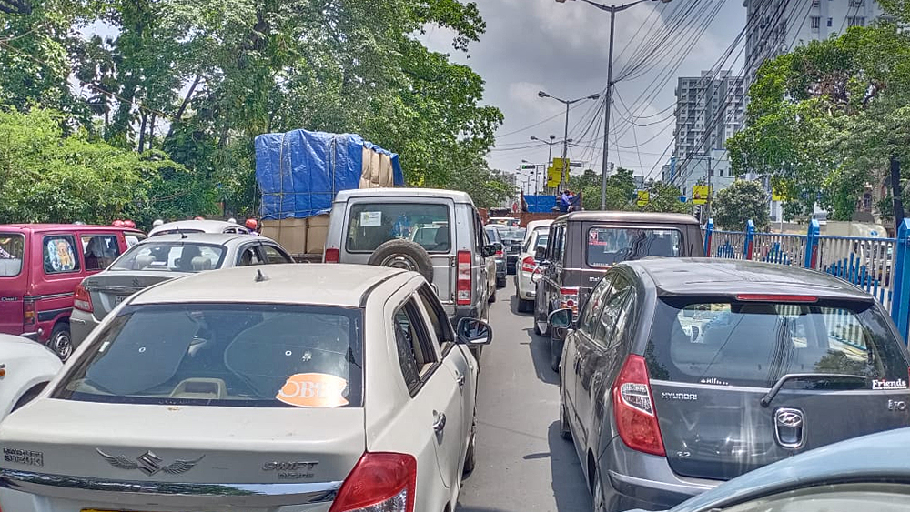 কেবল বিটি রোড নয়, তীব্র যানজটে হাঁসফাঁস অবস্থা সায়েন্স সিটি থেকে কামালগাজি পর্যন্ত ইস্টার্ন মেট্রোপলিটান বাইপাসের বিস্তীর্ণ অংশ। প্রচুর গাড়ির চাপে মন্থর বেলেঘাটা মেন রোড থেকে শুরু করে পূর্ব এবং দক্ষিণ কলকাতার বিভিন্ন রাস্তা। আর সেই সঙ্গে রাস্তার ধারে ধারে অফিস যাত্রীদের লম্বা লম্বা লাইন সরকারি বাসের জন্য প্রতীক্ষায়। যে লাইন লকডাউনের প্রথম দফায় রেশন দোকানের লাইনকেও ছাপিয়ে যাচ্ছে কখনও কখনও।
