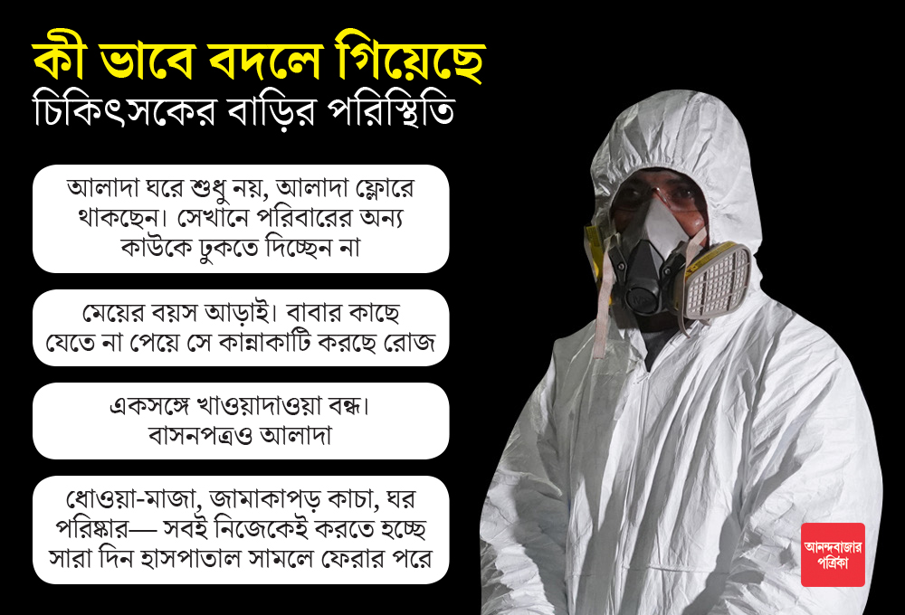 পরিবারকে কেন তাঁর ছোঁয়াচ থেকে দূরে থাকতে হচ্ছে? তিনি তো করোনায় আক্রান্ত নন। রোগীর সামনে গিয়ে দাঁড়ানোর সময়ে কি যথেষ্ট সুরক্ষিত ভাবে যাচ্ছেন না?