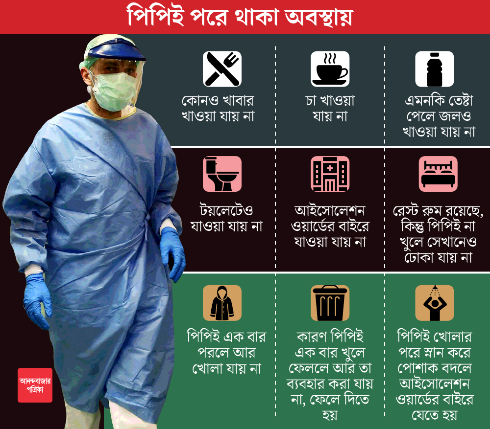 খিদে-তেষ্টা নিয়ে অভিযোগ নেই অনুপমদের। ৮-১০ বছরের ডাক্তারি জীবন পার করে এসেছেন, রোগীর দিকে সতর্ক নজর রাখার প্রয়োজন হলে খিদে-তেষ্টার কথা মনেও থাকে না। কিন্তু একটা পিপিই পোশাক এক বার খুলে ফেললে তা আর পরা যায় না, ফেলে দিতে হয়। আবার নতুন পোশাক পরতে হয়। তাই প্রকৃতির ডাকে সাড়া দেওয়ার আগেও দশ বার ভাবতে হচ্ছে এখন।