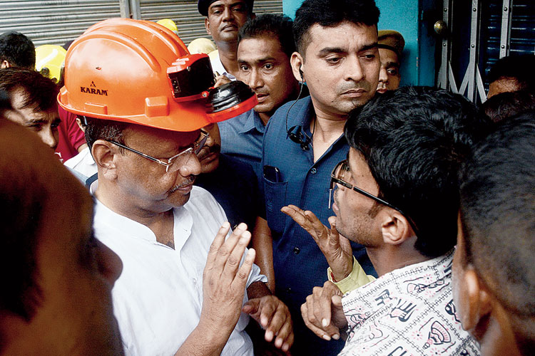 ক্ষুব্ধ বাসিন্দাদের মুখোমুখি মেয়র। রবিবার। ছবি: দেবস্মিতা ভট্টাচার্য