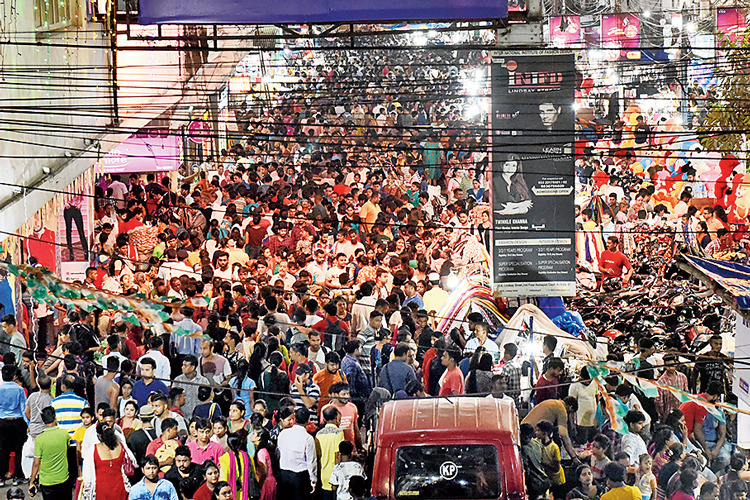 সালোয়ার কামিজ থেকে শাড়ি, লো ওয়েস্ট জিনস— প্রায় সবেতেই একটি কিনলে অন্যটি ফ্রি পাওয়ার অফারে উপচে পড়ছে নিউ মার্কেটের বাজার চত্বর। অনলাইনে কেনাকাটার যুগেও এত ভিড় ঠেলে দোকানে আসতে ইচ্ছে করে? প্রশ্নটা শুনে পিয়ালী চৌধুরির উত্তর, ‘‘পুজোর বাজার অনলাইনে কেনা পোষায় না। হাতে ধরে, দেখে কেনার মজাই আলাদা। এর পরে রেস্তরাঁয় খাওয়াদাওয়া তো সারতে হবে। সেটা অনলাইনে সম্ভব!’’