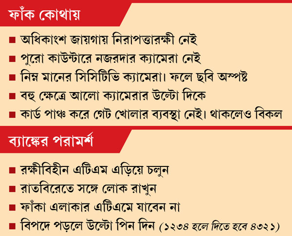 বেঙ্গালুরুর ওই ঘটনার পরে নড়ে বসেন এ রাজ্যের পুলিশ ও ব্যাঙ্ককর্তারা। বৈঠকে উঠে আসে এটিএম নিরাপত্তা বাড়ানোর ‘হাজার’ দাওয়াই। যেমন, রক্ষী মোতায়েন করতে হবে। বসাতে হবে উন্নত সিসিটিভি। এটিএম-এর দরজায় কার্ড পাঞ্চ করে ঢোকার ব্যবস্থা রাখতে হবে। পুলিশকর্তারাই মানছেন, সে সব কাজে লাগানো হয়নি। ফলে গ্রাহকেরা যেমন গভীর রাতে বা ভোরে টাকা তুলতে গেলে নিরাপদ নন, তেমনই নিরাপদ নয় এটিএম-ও। পুলিশ সূত্রে খবর, কলকাতাতেও রক্ষীহীন এটিএম-এর বিপদ রয়েছে। সম্প্রতি আমহার্স্ট স্ট্রিটে এক বেসরকারি ব্যাঙ্কের এটিএম থেকে জালিয়াতদের ধরা হয়। সেখানেও কোনও রক্ষী ছিল না।