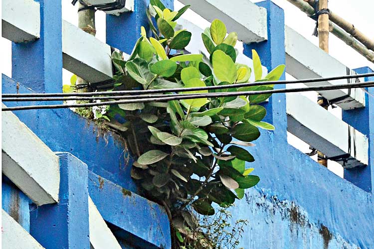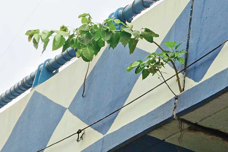 গড়িয়াহাট উড়ালপুলের গা বেয়ে উঠেছে গাছ, তারই নীচে ধরেছে ফাটল। শুক্রবার। ছবি: শৌভিক দে