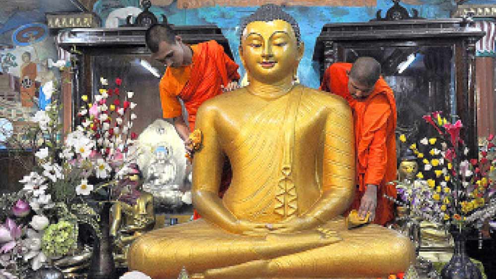 ‘রাজধানী’তে একটি বৌদ্ধ বিহারের প্রয়োজন বোধ করেছিলেন অনাগারিক ধর্মপাল। সেই পরিকল্পনা যখন রূপায়িত হল, তত দিনে রাজধানী সরে গেছে দিল্লিতে। তবু কলেজ স্কোয়ারের কাছে শ্রীধর্মরাজিকা চৈত্য বিহার এ শহরে বৌদ্ধ ধর্ম চর্চার গুরুত্বপূর্ণ কেন্দ্র, বুদ্ধের পবিত্র দেহাস্থি আছে এখানে। শহরে ছড়িয়ে বহু বৌদ্ধ মন্দির— মধ্য কলকাতার বৌদ্ধ ধর্মাঙ্কুর বিহার কলকাতার অন্যতম পুরনো বৌদ্ধ মন্দির, সেন্ট্রাল অ্যাভিনিউ থেকে টেরিটিবাজার যাওয়ার মুখে আছে মায়ানমার বৌদ্ধ মন্দির, ট্যাংরায় তাইওয়ানের বৌদ্ধ সংগঠন প্রতিষ্ঠিত মন্দির ফো গুয়াং শান। ইডেন উদ্যানে আছে বর্মি প্যাগোডা। দক্ষিণে লেক টেরেস রোডে আছে জাপানি বৌদ্ধ মন্দির, চক্রবেড়িয়ায় তিব্বতি বৌদ্ধ ধর্মের প্রতিনিধি কর্মা গণ মঠ। তাইল্যান্ডের বৌদ্ধ ধর্মাবলম্বীরা জড়িয়ে মধ্যমগ্রামের ওয়াত তাই জ্ঞানবিহার-এর সঙ্গে। দক্ষিণ দমদমের যশোর রোডে আছে চিনা বৌদ্ধ মন্দির। বৈশাখী তথা বুদ্ধপূর্ণিমা সমাগত— বুদ্ধের জন্ম, বুদ্ধত্ব লাভ ও মহাপরিনির্বাণকে মিলিয়ে দেয় এই শুভক্ষণ। তেমনই, বৌদ্ধ ধর্মের নানা শাখাকেও মিলিয়ে দেয় এই শহর। নীচের ছবিতে ২০১৪ সালে মহাবোধি সোসাইটির মন্দিরে বুদ্ধজয়ন্তী।